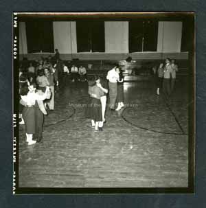 Black and white photograph of a school dance. Students are in the gym dancing. Some are sitting on benches in the background. On back stamped in ink, "Photograph by Dan Noel, Dec 6 1957." Written in pencil, "684."