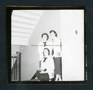 Black and white photograph portrait of a student group. There are three girls standing together with matching sweathers on. They are standing against a wall next to a stairway. On back stamped in ink, "Photograph by Dan Noel, Dec 9 1957." Written in pencil, "686."Collection