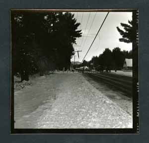 Black and white photograph of a broken electrical line. In the middle is an electrical line that is broken half on the ground. A road is on the right side of the electrical lines. Across the street on the right are some parked cars and a sign that says, "Esso". In the background are mountains. Snow is on the grass on the left. On back stamped in ink, "Photograph by Dan Noel, Dec 13, 1957." Written in pencil, "702."Collection