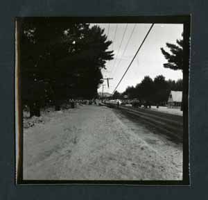 Black and white photograph of a broken electrical line. In the middle is an electrical line that is broken half on the ground. A road is on the right side of the electrical lines. Across the street on the right are some parked cars and a sign that says, "Esso". In the background are mountains. Snow is on the grass on the left. On back stamped in ink, "Photograph by Dan Noel, Dec 13, 1957." Written in pencil, "703."Collection