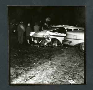 Black and white photograph of a car crash. The cars are on the right. The car on the left is badly damaged in the front. Next to the car on left are a group of people surrounding a police officer taking a report. Behind them is a sign that says, "Gulf." Stamped on the back in ink, "Photograph by Dan Noel, Dec 14, 1957. Written in pencil, "707."Collection