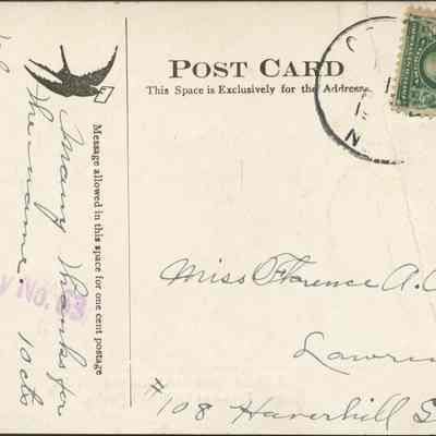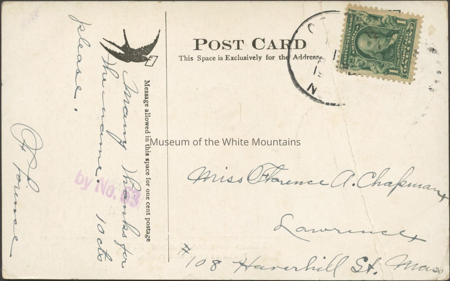 Back Description: Typical postcard back. Features a handwritten note, postmark, and postage stamp.