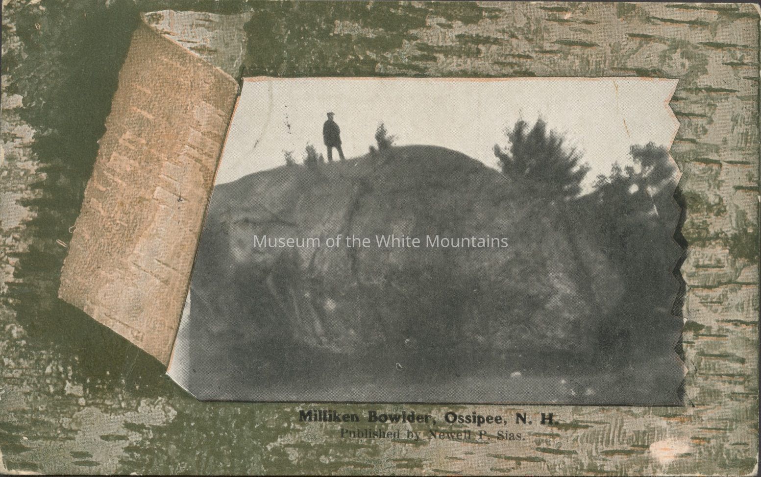 Black and white image of a person standing on a large rock. Image is inside a border that looks like peeled tree bark. Caption reads, “Milliken Bowlder, Ossipee, NH.”
