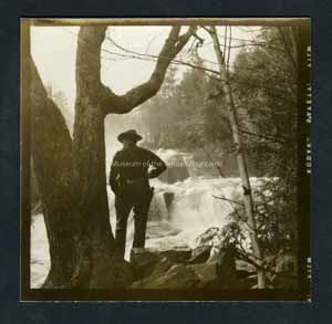 Black and white photograph of a park ranger standing by a waterfall. The ranger is next to a tree looking down at the waterfall. Below is the waterfall. In and surounding the waterfall are big rocks. Trees are also surrounding the waterfall. On back stamped in ink, "Photograph by Dan Noel, Dec 21, 1957. Written on back in pencil, "711."Collection
