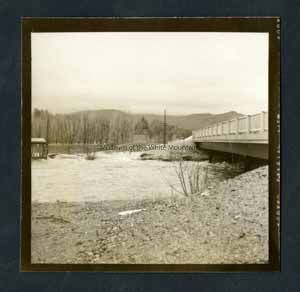 Black and white photograph of a bridge and a river underneath. On right is the bridge. On left there is a small shed surounded by water. In back is another building near the water. Behind in the background are the mountains. Stamped on back in ink, "Photograph by Dan Noel, Dec 21 1957." Written in pencil, "712."Collection
