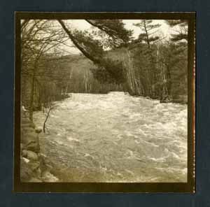 Black and white photograph of a river.The river is surrounded by rocks and trees. In the background are the mountains. Stamped in ink on back, "Photograph by Dan Noel, Dec 21, 1957." Written in pencil, "713."