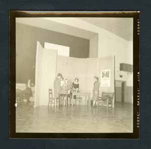 Black and white photograph of a school play. In the middle is a background stage prop. A few students are acting out a play. Chairs and tables are in front of them, being used as props. To the left is a group of chairs with a woman standing behind them. They are located in a gym. Stamped on the back in ink, "Photograph by Dan Noel, Dec 20, 1957." Written on the back in pencil, "716."Collection