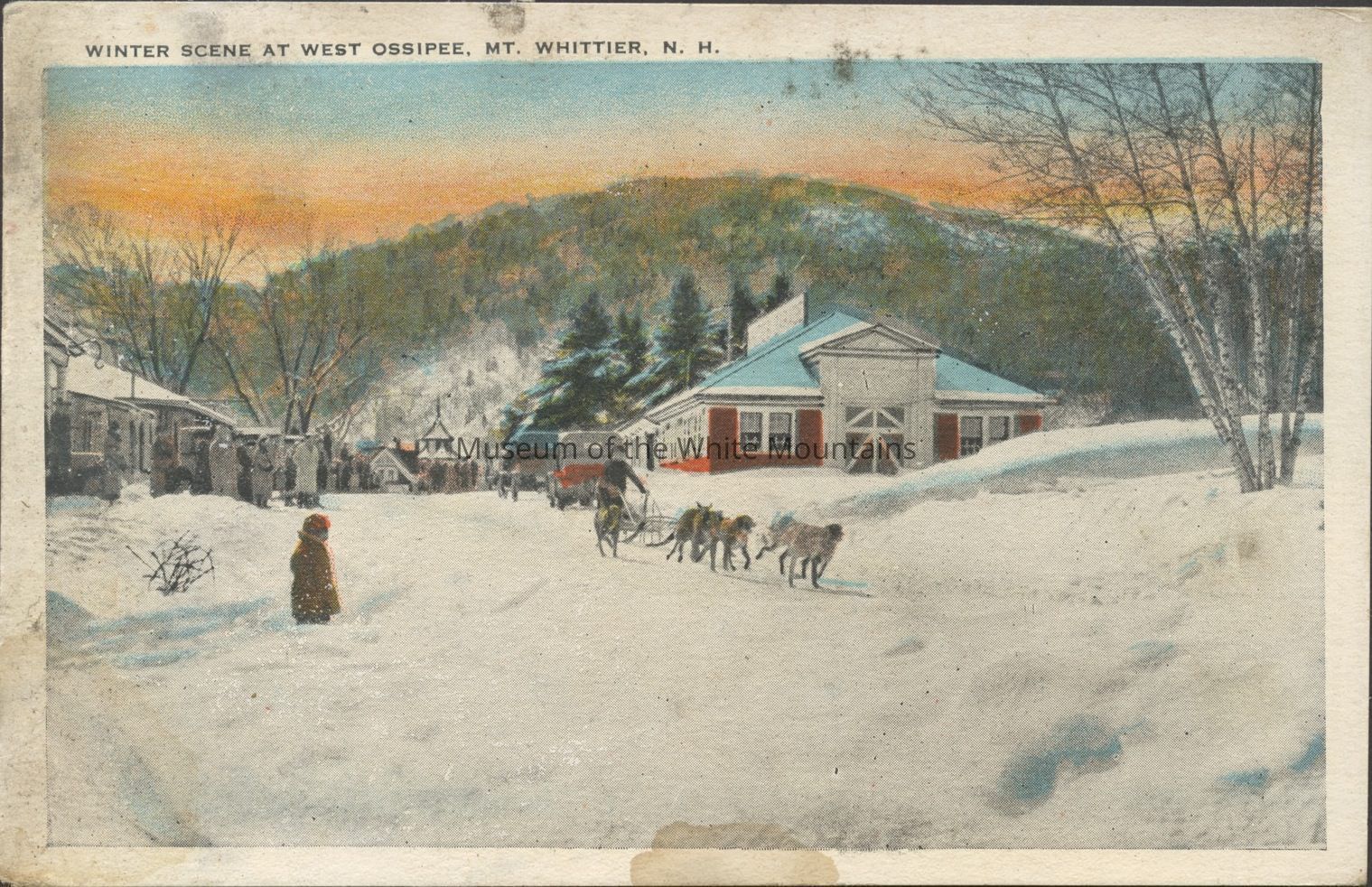 Colored image of a team of sled dogs traveling down a path through a town with many people watching. There is snow all around. Caption reads, “Winter scene at West Ossipee, Mt. Whittier NH.” Back Description: Typical postcard back.