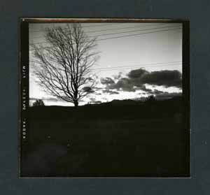 Black and white photograph a scenic view. On the left is a tree. Behind it are mountains ranges and clouds. The bottom half is very dark, hard to see. On back stamped in ink, "Photograph by Dan Noel, Dec 24, 1957." Written in pencil, "720."Collection