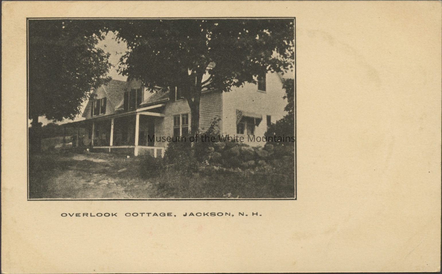 Sepia toned image of a building with several large dormers and a porch. Caption reads, “Overlook Cottage, Jackson, N.H.”