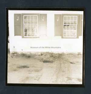 Black and white photograph of the side of a house. Pictured is a side of a white house with dark shutters on the windows. The ground is mostly dirt with some dark spots on the ground. There are some objects on the ground next to the foundation of the house. Photo is straight on. Stamped on back is "Photograph by Dan Noel Nov 23 1957." written in pencil, "633."