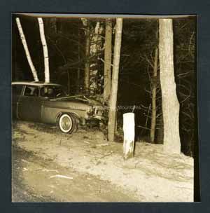 Sepia toned photograph of a car crash. To the left there is a car that has gone off the road and hit a tree. The front end of the car has damage to it. The hood is bent up and the bumper and fender is crushed in. There is a man sitting in the drivers seat. There are other trees visible. Stamped on back is "Photograph by Dan Noel Nov 27 1957." written in pencil, "634."