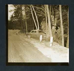Sepia toned photograph of a car crash. In the center middleground there is a car that has gone off the road and hit a tree. The front end of the car has damage to it. The hood is bent up and the bumper and fender is crushed in. The road is seen to the left. There are other trees visible. Stamped on back is "Photograph by Dan Noel Nov 27 1957 PROOF." written in pencil, "635."