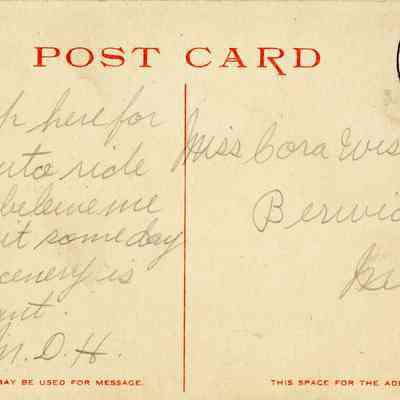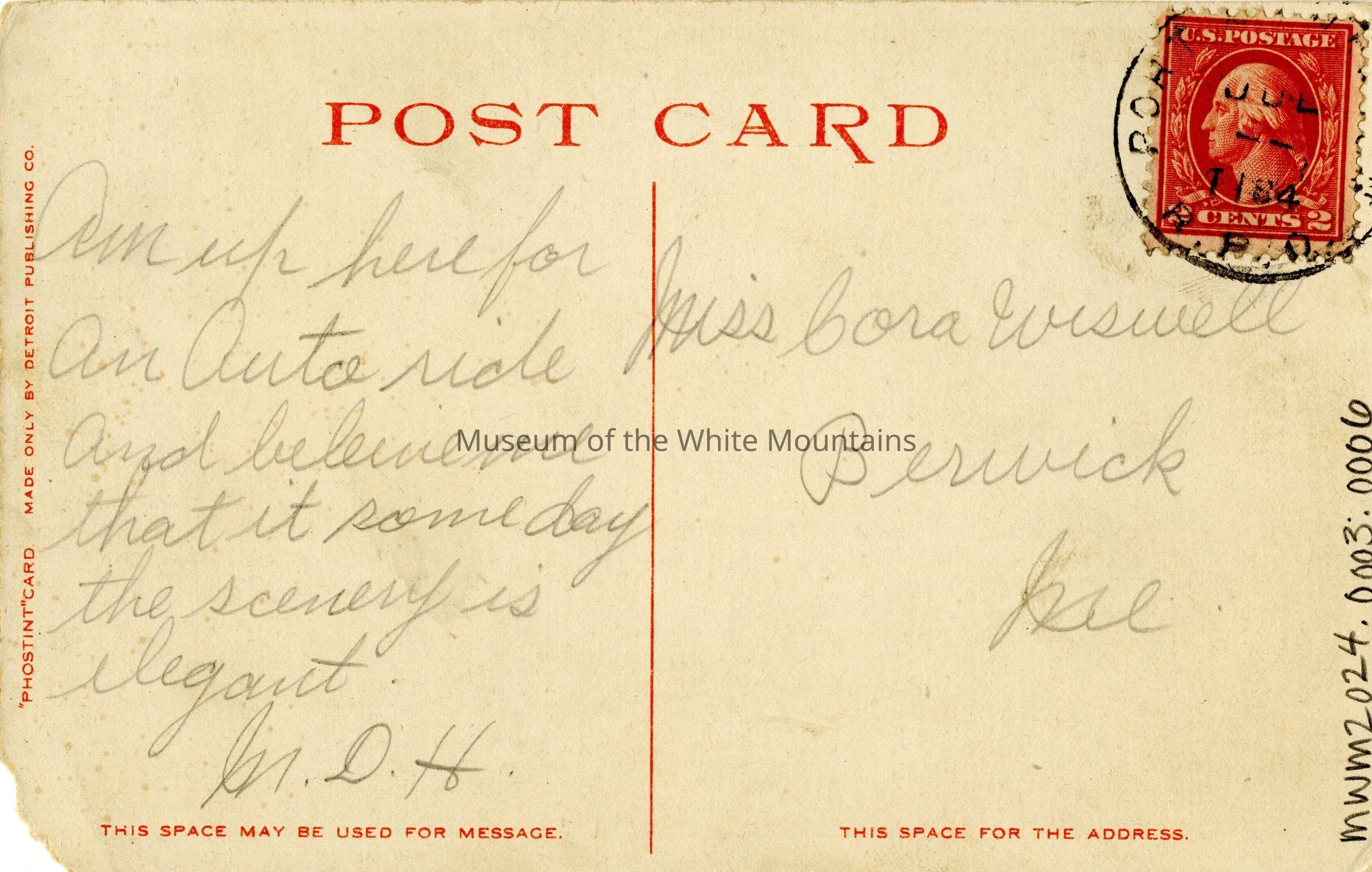 The transcription on the back reads: "Am up here for an auto ride and believe me that it some day the scenery is elegant. M. D. H." Postmarked in July c. 1907-1915. the card was sent to Miss Cora Wiswell, Berwick, Maine.Subject