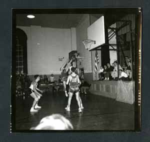 Black and white photograph of a basketball game. There are three players in the center of the photograph and one to the left. The basketball hoop is to the right. To the right behind the basketball hoop is a stage where people are sitting. In the background there are more people sitting along the wall. Stamped on back is "Photograph by Dan Noel Dec 6 1957." written in pencil, "642."