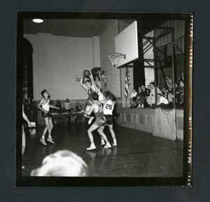Black and white photograph of a basketball game. There are three players in the center of the photograph and one to the left. One of the players has jumped up with the ball in his hands. The basketball hoop is to the right. To the right behind the basketball hoop is a stage where people are sitting. In the background there are more people sitting along the wall. Stamped on back is "Photograph by Dan Noel Dec 6 1957." written in pencil, "643."