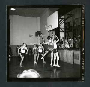 Black and white photograph of a basketball game. There are five players in the center of the photograph. One of the players has jumped up to block another from shooting the ball into the hoop. The basketball hoop is to the right. To the right behind the basketball hoop is a stage where people are sitting. In the background there are more people sitting along the wall. Stamped on back is "Photograph by Dan Noel Dec 6 1957." written in pencil, "644."