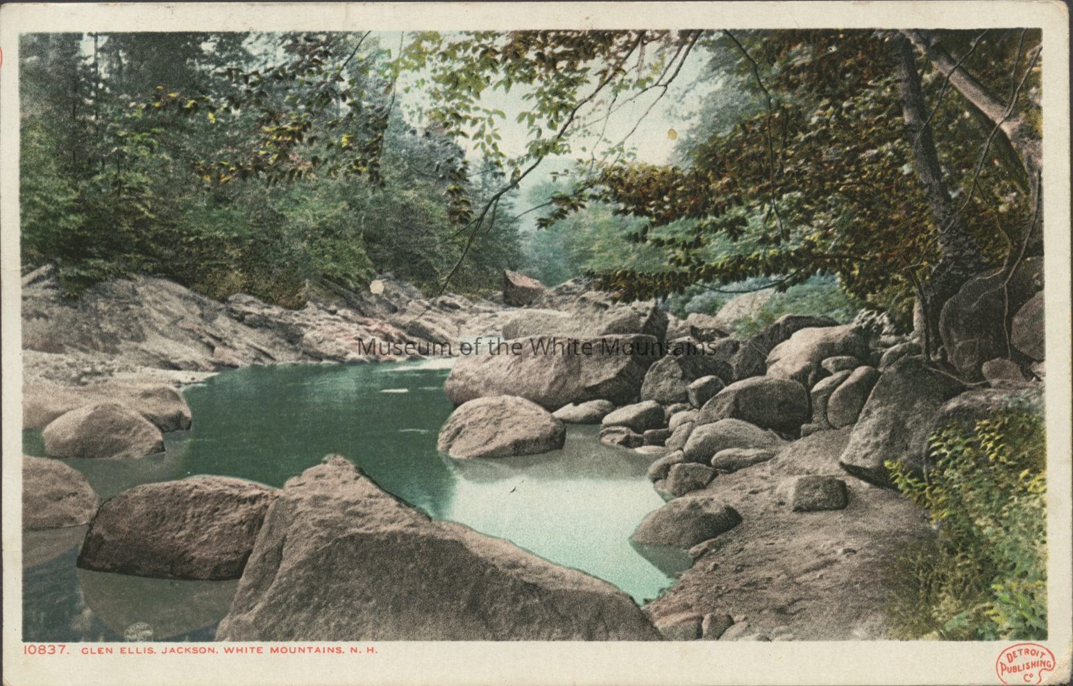 Colored image of a rocky river in a wooded area. Caption reads, “Glen Ellis, Jackson, White Mountains NH.”