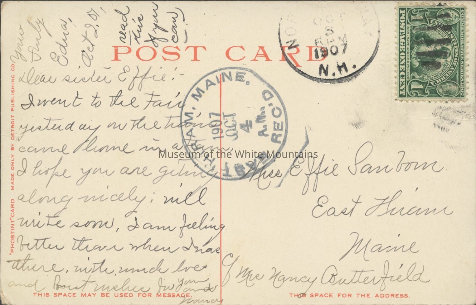 Transcription: "Dear Sister Effie:- I went to the fair, yesterday in the train came home in a train. I hope you are getting alone nicely; will write soon, I am feeling better than when I was there with uncle loves and… you … yours truly Edna. Oct. 2, 07 Read … if you can"