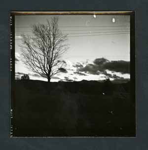 Black and white photograph of a scenic view. On left there is a tree. On right there is a fence. In background there are the mountains. Above are electrical lines. On back stamped in ink is, "Photograph by Dan Noel, Dec 24, 1957." Written in pencil, "721."Collection