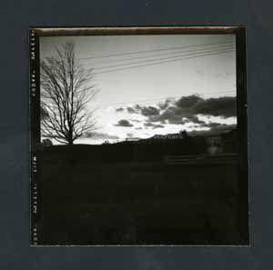 Black and white photograph of a scenic view. On left there is a tree. On right there is a fence. Behind the fence is a house. In background there are the mountains. Above are electrical lines. On back stamped in ink is, "Photograph by Dan Noel, Dec 24, 1957." Written in pencil, "722."Collection