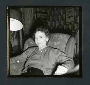 Black and white photograph portrait of a woman. The woman is in the middle sitting on a chair. Next to her on the left is a lamp. Behind the lamp is a window with curtains. Behind her are walls covered with wallpaper and two framed painting and picture. On the back stamped in ink is, "Photograph of Dan Noel, Dec 25, 1957." Written in pencil, "725.".Collection