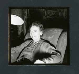 Black and white photograph portrait of a woman. The woman is in the middle sitting on a chair. Next to her on the left is a lamp. Behind the lamp is a window with curtains. Behind her are walls covered with wallpaper and a framed painting. On the back stamped in ink is, "Photograph of Dan Noel, Dec 25, 1957." Written in pencil, "726."Collection