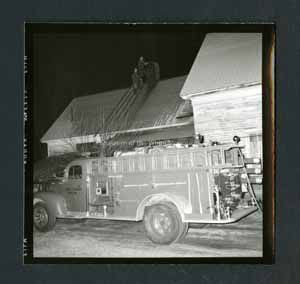 Black and white photograph of a North Conway fire truck. On the side of the fire truck door it says, "North Conway Engine 1." Behind the truck is a house. On the roof of the house there are 2 firemen by the chimney. On back stamped in ink is, "Photograph by Dan Noel, Dec 23 1957." On back written in pencil, "730."Collection