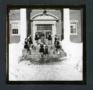 Black and white photograph of a school cheering team. In front of the school they are posing for a team photo portrait. They are standing in a circle on seperate steps. Above the doors is an engraving sign that says, "A. Crosby Kennett School." On back stamped in ink is, "Photograph by Dan Noel, Jan 10, 1958." Written in pencil is, "733."Collection