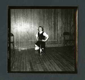 Black and white photograph of a cheerleader. She is kneeling, posing for a portrait. On both sides of her there are chairs. In front of her is a cheerleading prop. On back stamped in ink, "Photograph by Dan Noel, Dec 10, 1958." Written in pencil is, "735."Collection