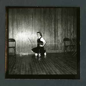 Black and white photograph of a cheerleader. She is kneeling, posing for a portrait. On both sides of her there are chairs. In front of her is a cheerleading prop. On back stamped in ink, "Photograph by Dan Noel, Dec 10, 1958." Written in pencil is, "737."Collection