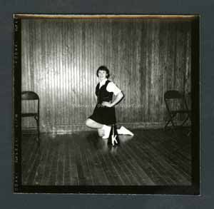 Black and white photograph of a cheerleader. She is kneeling, posing for a portrait. On both sides of her there are chairs. In front of her is a cheerleading prop. On back stamped in ink, "Photograph by Dan Noel, Dec 10, 1958." Written in pencil is, "738."Collection
