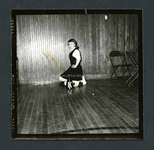 Black and white photograph of a cheerleader. She is kneeling, posing for a portrait. On both sides of her there are chairs. In front of her is a cheerleading prop. On back stamped in ink, "Photograph by Dan Noel, Dec 10, 1958." Written in pencil is, "739."Collection