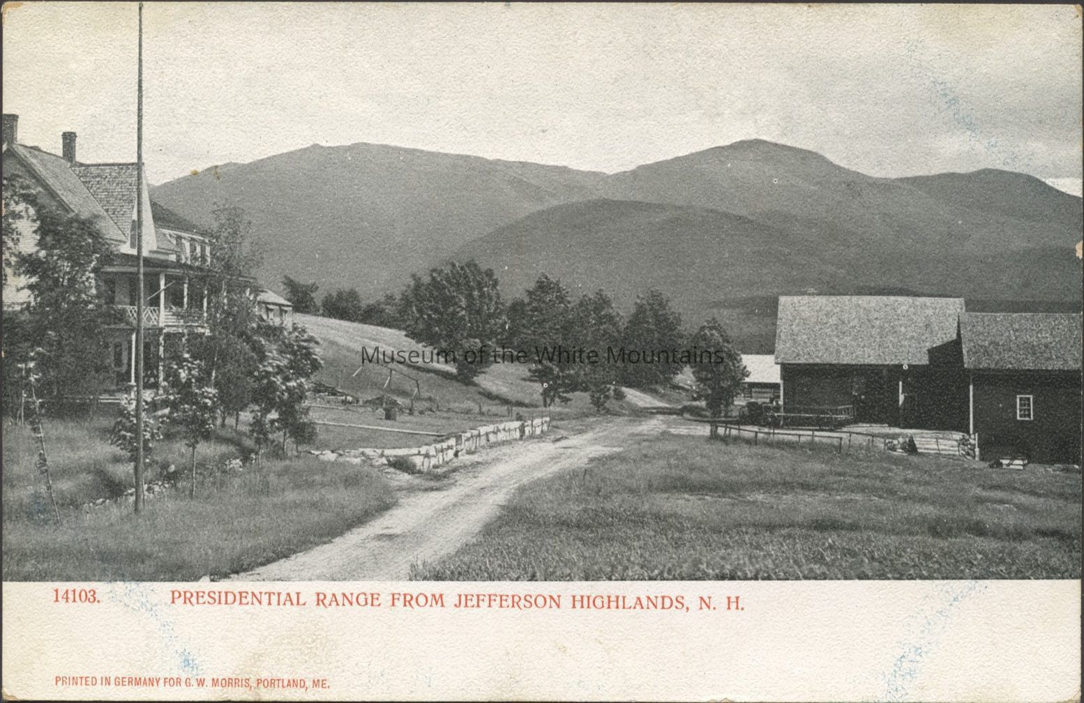 Black and white image of a dirt road with buildings on either side and mountains in the distance. Caption reads, “Presidential Range from Jefferson Highlands, NH.”