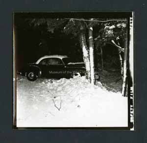 Black and white photograph of a car crash. One car is off the road in a snow bank and against a tree. There is snow on the side and on the road. On back stamped in ink is, "Photograph by Dan Noel, Jan 10, 1958." Written in pencil, "745."