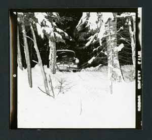 Black and white photograph of a car crash. One car is off the road in a snow bank and against a tree. There is snow on the side and on the road. On back stamped in ink is, "Photograph by Dan Noel, Jan 10, 1958." Written in pencil, "746."