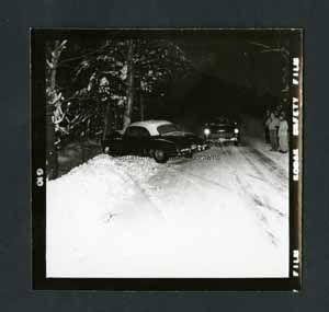 Black and white photograph of a car crash. One car is off the road in a snow bank and against a tree. Another car is in front of the car parked. A group of people are standing on the other side of the street. There is snow on the side and on the road. On back stamped in ink is, "Photograph by Dan Noel, Jan 10, 1958." Written in pencil, "747."Collection