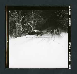Black and white photograph of a car crash. One car is off the road in a snow bank and against a tree. Another car is in front of the car parked. A group of people are standing on the other side of the street. There is snow on the side and on the road. On back stamped in ink is, "Photograph by Dan Noel, Jan 10, 1958." Written in pencil, "748."Collection