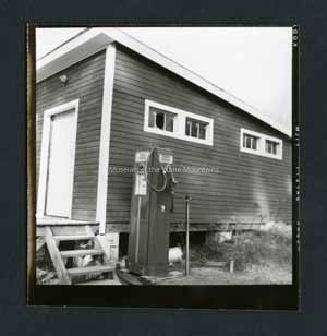 Black and white photograph of a house. One of the windows on the right side of the house is a broken window. Next to the house is a gas pump. Next to the pump is a pole on the right. On left are a few wooden stairs going up to the house. Stamped on back in ink is, "Photograph by Dan Noel, Dec 27, 1957." Written in pencil, "749."Collection
