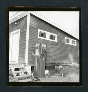 Black and white photograph of a house. One of the windows on the right side of the house is a broken window. Next to the house is a gas pump. Next to the pump is a pole on the right. On left are a few wooden stairs going up to the house. Stamped on back in ink is, "Photograph by Dan Noel, Dec 27, 1957." Written in pencil, "750."Collection