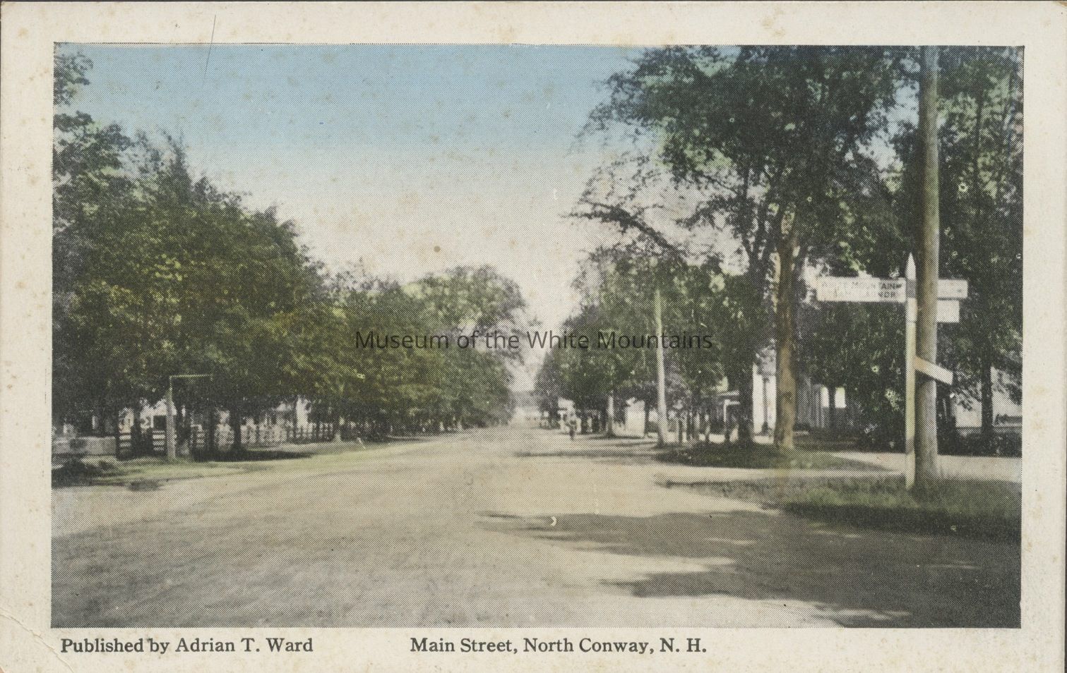 Colored image of a dirt road lined with buildings, utility poles, a fence and trees. Caption reads, “Main Street, North Conway NH.”