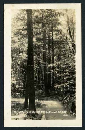 This is an image of a dirt path in a wooded area. It is known as the Primeval Forest from the Rim Trail at the Flume Gorge. Item is often referred to as a mini-postcard.Collection
