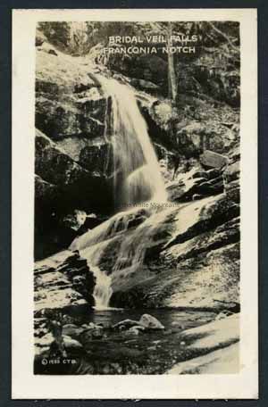 This is an image of water falling among steep rocks. It is Bridal Veil Falls. Item is often referred to as a mini-postcard.