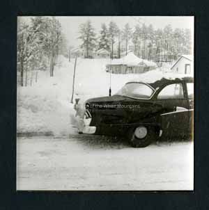 Black and white photograph of the back of a police car. The car is parked on the side. The back rear light is damaged. Two houes are behind the car. It is snowing. On back written in pencil, "796."