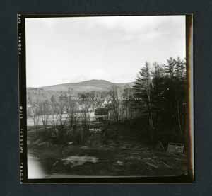 Black and white photograph or an aerial view of a house. In the front of the house there is a large piece of land. Somesome wooden boards in a pile on right in the field. In the background are several houses and a mountain range. On back stamped in ink, "Photograph by Dan Noel, "Dec 27 1857." Written in pencil, "799."Collection