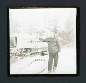 Black and white photograph of a sno-cat. Next to the sno-cat is a man posing with it. Trees are behind them and snow is on the ground.