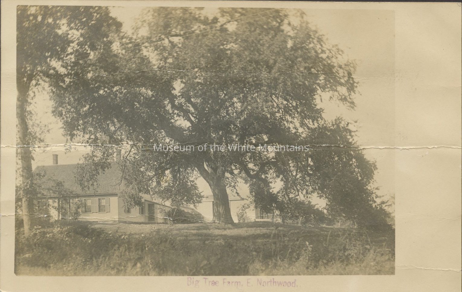 Sepia toned image of a small house and barn by a large tree. Caption reads, “Big Tree Farm, E. Northwood.”