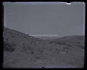 Black and white glass plate negative of a hillside with small shrubs and plants scattered in the foreground. In the right middleground a house and barn is visible.