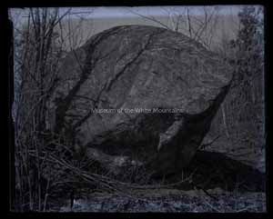 Black and white glass plate negative of a large boulder surrounded by small trees and brush. (duplicate of MWM2010.0001.2709)