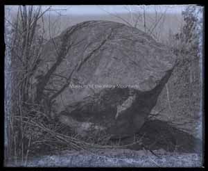 Black and white glass plate negative of a large boulder surrounded by small trees and brush. (duplicate of MWM2010.0001.2708)